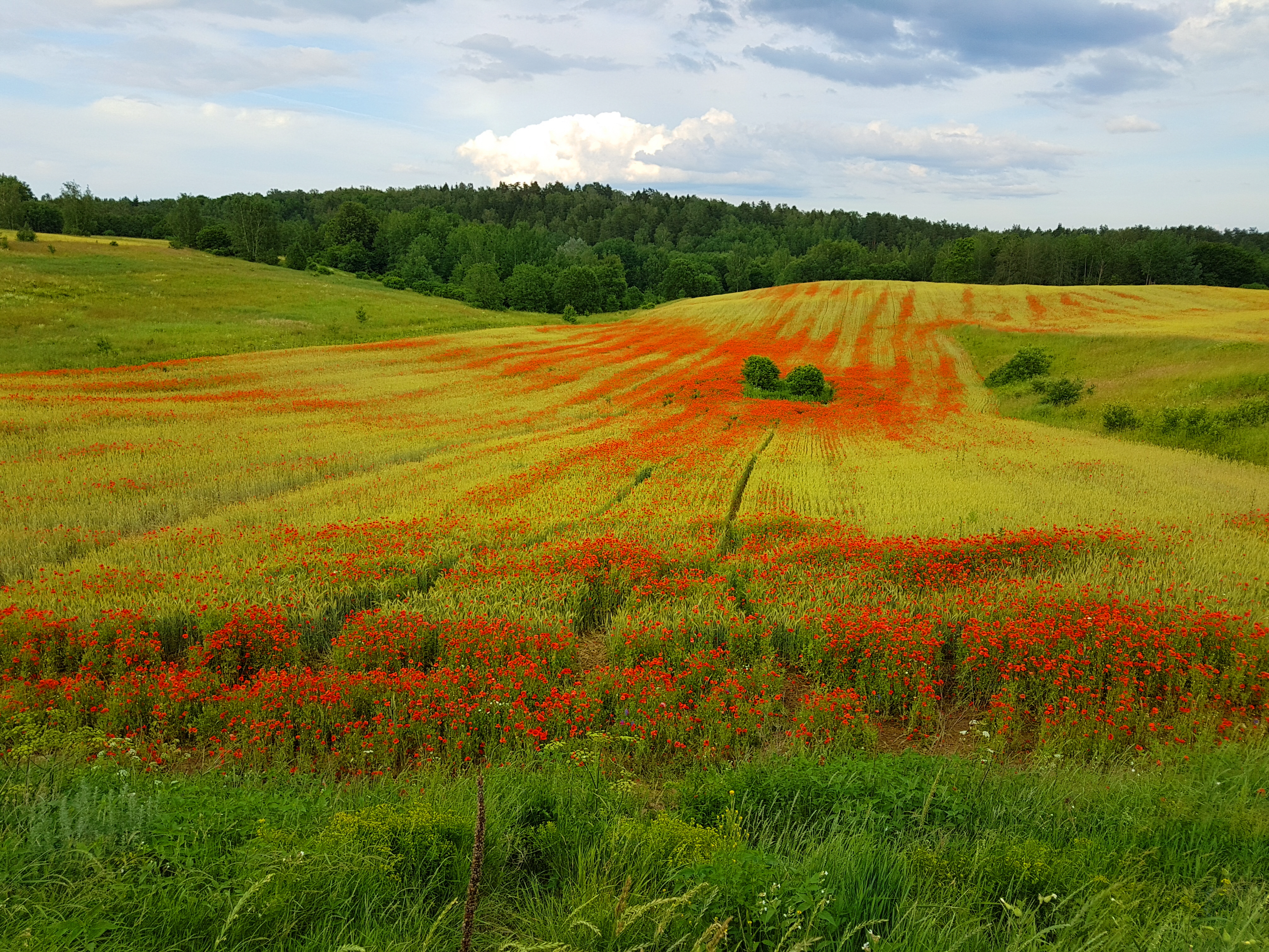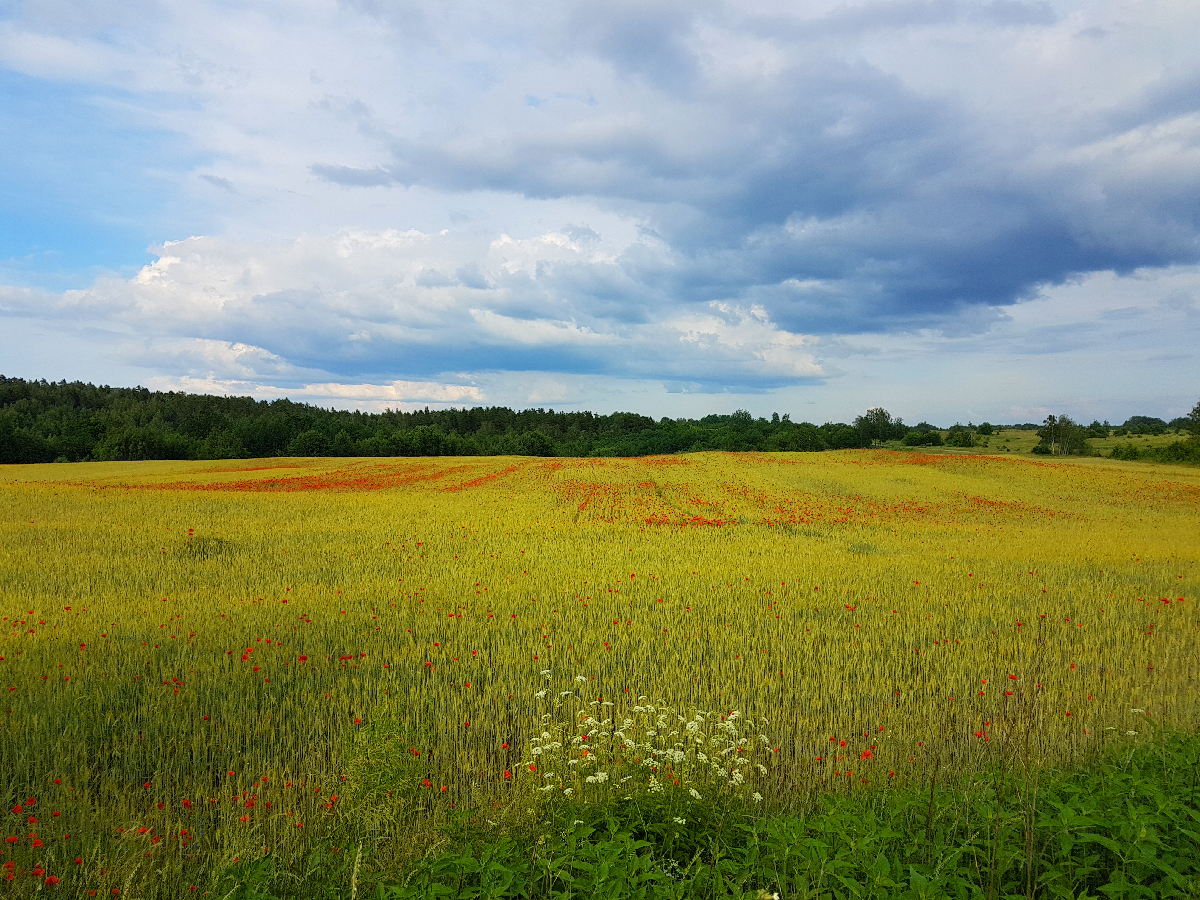 점점 곡식알이 익어가는 연노란색 라이밀밭에 붉은색이 시선을 끈다. 저 붉은색의 정체는 무엇일까? 라이밀을 헤치고 들어가 확인하거나 배경을 삼아 사진을 찍고 싶은 마음이 일어난다.
