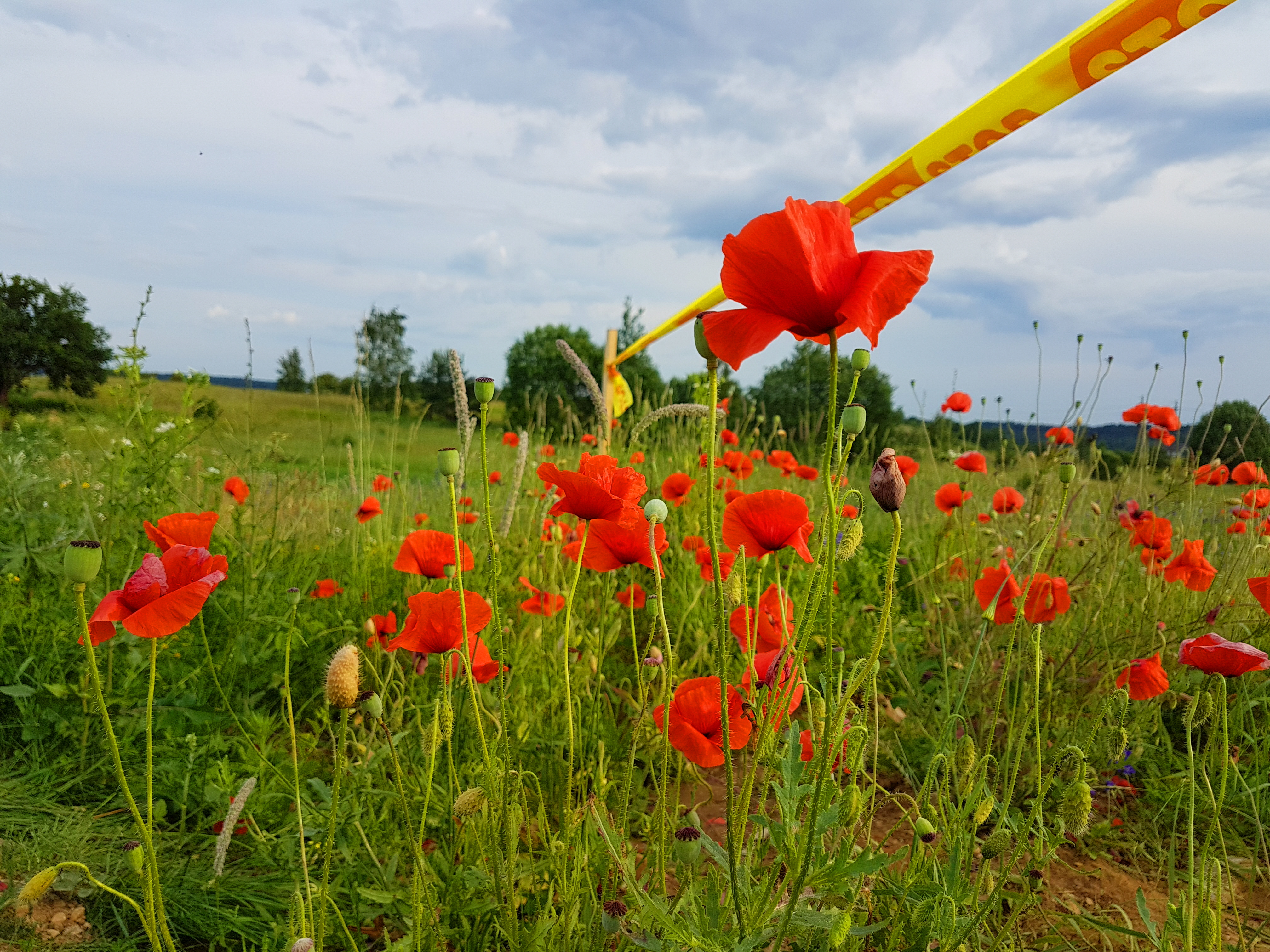 붉은색 개양귀비꽃이 유혹하자 사람들이 무분별하게 사유지 밭에 들어가서 곡식을 망쳐 놓기 때문이다. 밭주인이 트랙터에 앉아서 하루 종일 지켜보고 있다. 아름다움에 매혹되더라도 라이밀밭이 농부의 생계임을 잊어서는 안 되겠다.