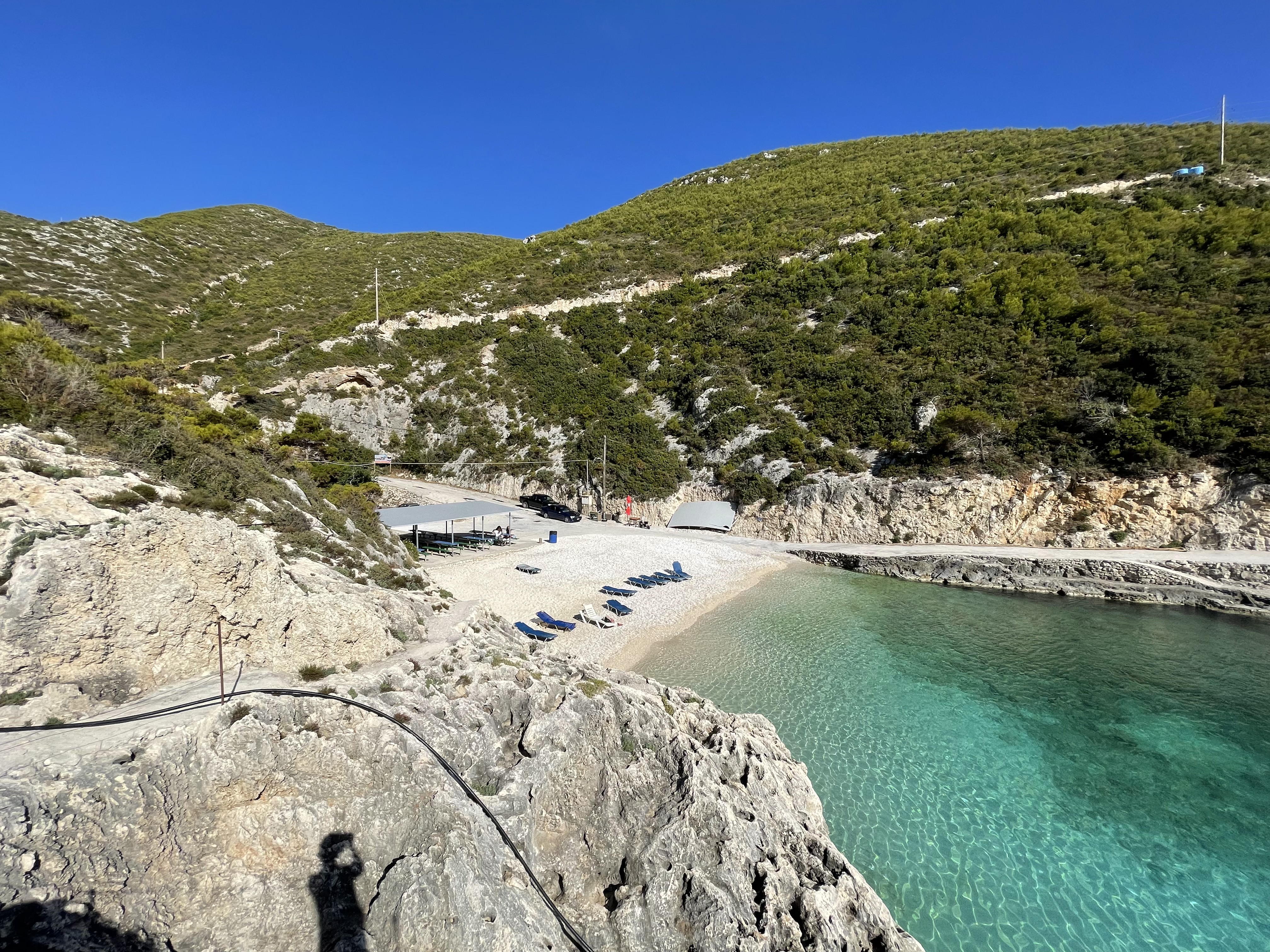 나바지오 해변 절벽 전망대에서 내려다 보이는 하얀 백사장과 비취색 바다가 해수욕을 하고 싶다는 마음을 더욱 충동질한다. 그렇다고 수백미터 절벽 아래로 뛰어들기(다이빙)는 할 수 없는 일이다. 나바지오 인근에 접근할 수 있는 해수욕장을 찾아본다. 그 중 하나가 포르토 브로미(포르토브로미 Porto Vromi)다. 구글지도에서 확인해보니 15km 거리에 예상 소요시간이 30분이니 이것이 구불구불하고 험준한 길임을 미리 알려준다. 포르토 브로미는 나바지오 해변으로 배로 가는 가장 짧은 거리에 있는 항구다.