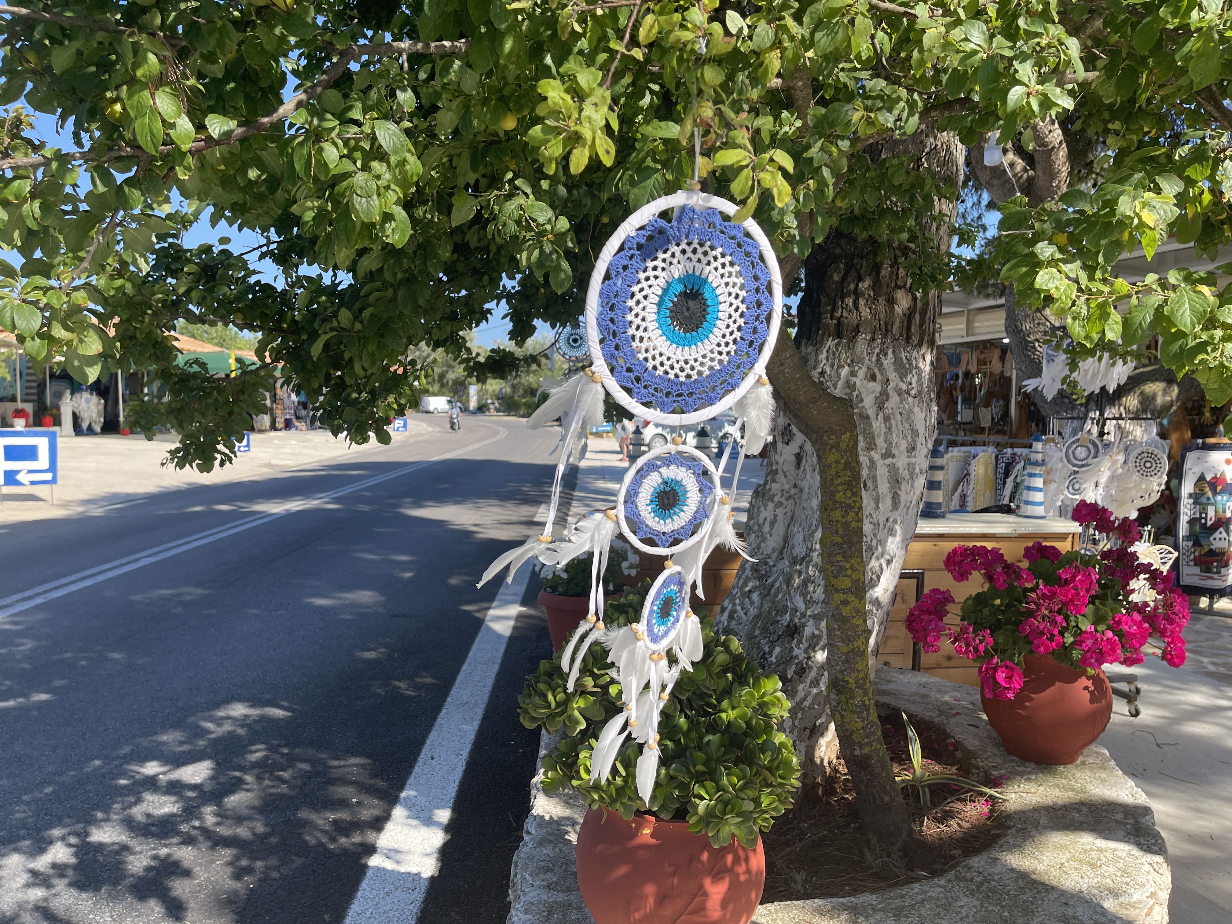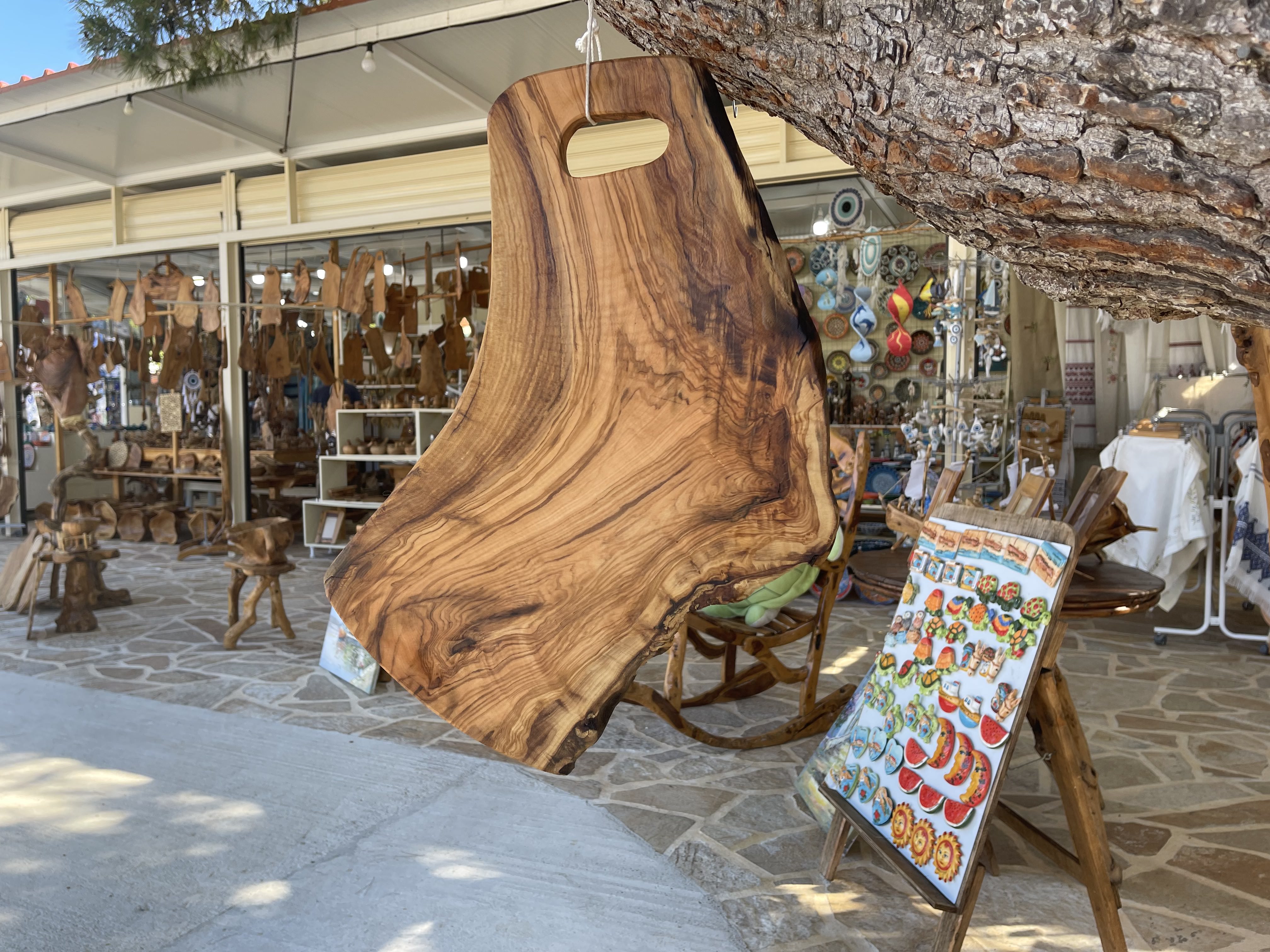 주렁주렁 매달린 나무 도마가 시선을 잡아당긴다. 점원이 다가오더니 이 도마는 2000여년이 된 올리브 나무로 만든 것이다라고 한다. 2000년이라는 말에 장사꾼의 유혹에 말려들지 말아야지라고 생각하면서 경계심을 늦추지 않는다. 그러자 점원은 좀 더 설명을 이어간다. 2007년 그리스 대화재로 자킨토스키에 있는 여전히 열매를 맺는 오래된 올리브 나무들이 큰 피해를 보았고 그때 불탄 올리브 나무를 이용해 도마를 만들어 팔고 있다고 한다. 그래도 수령 2000여년은 너무하다라는 생각을 머리 속에서 떨쳐내기가 힘이 든다.
