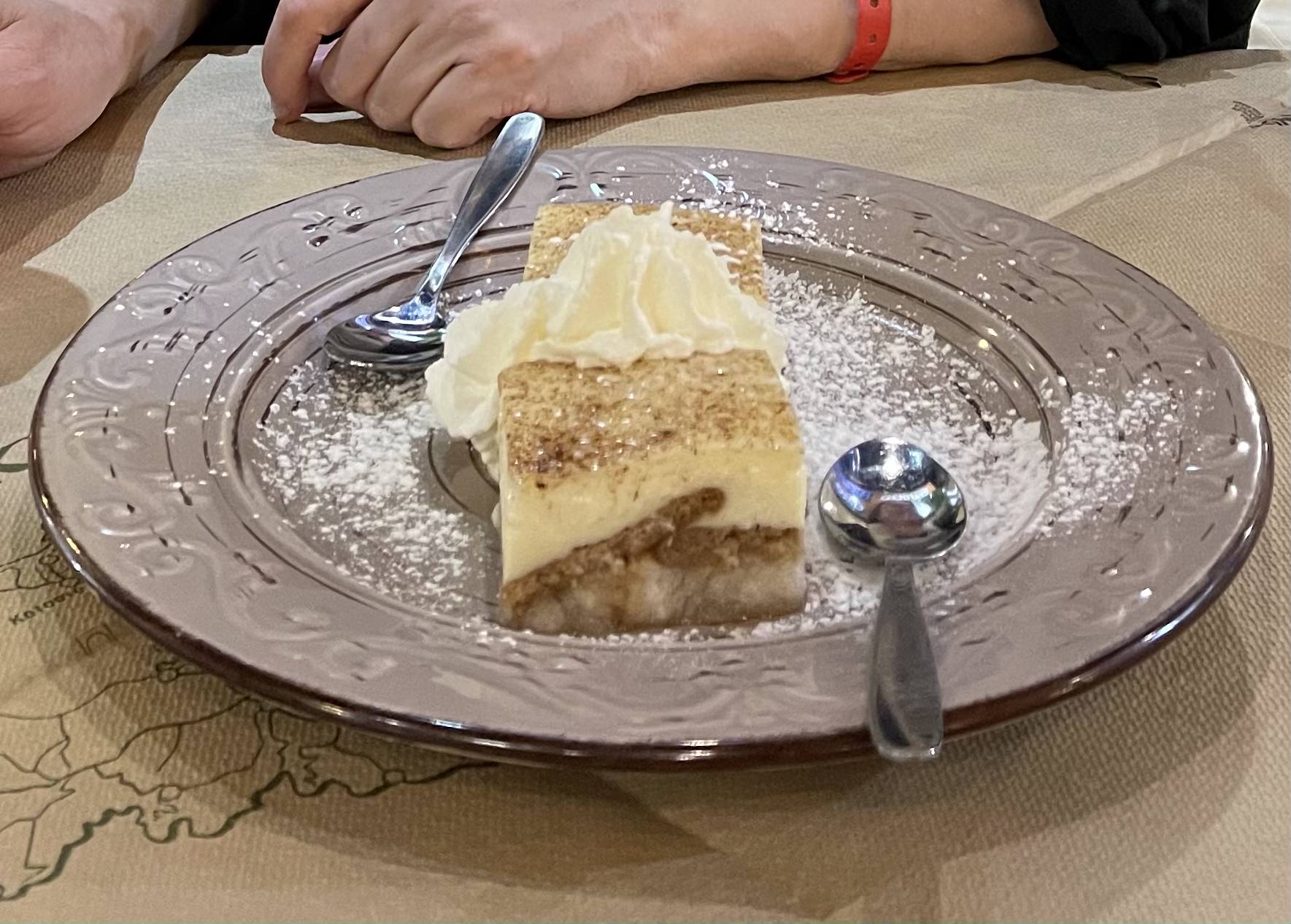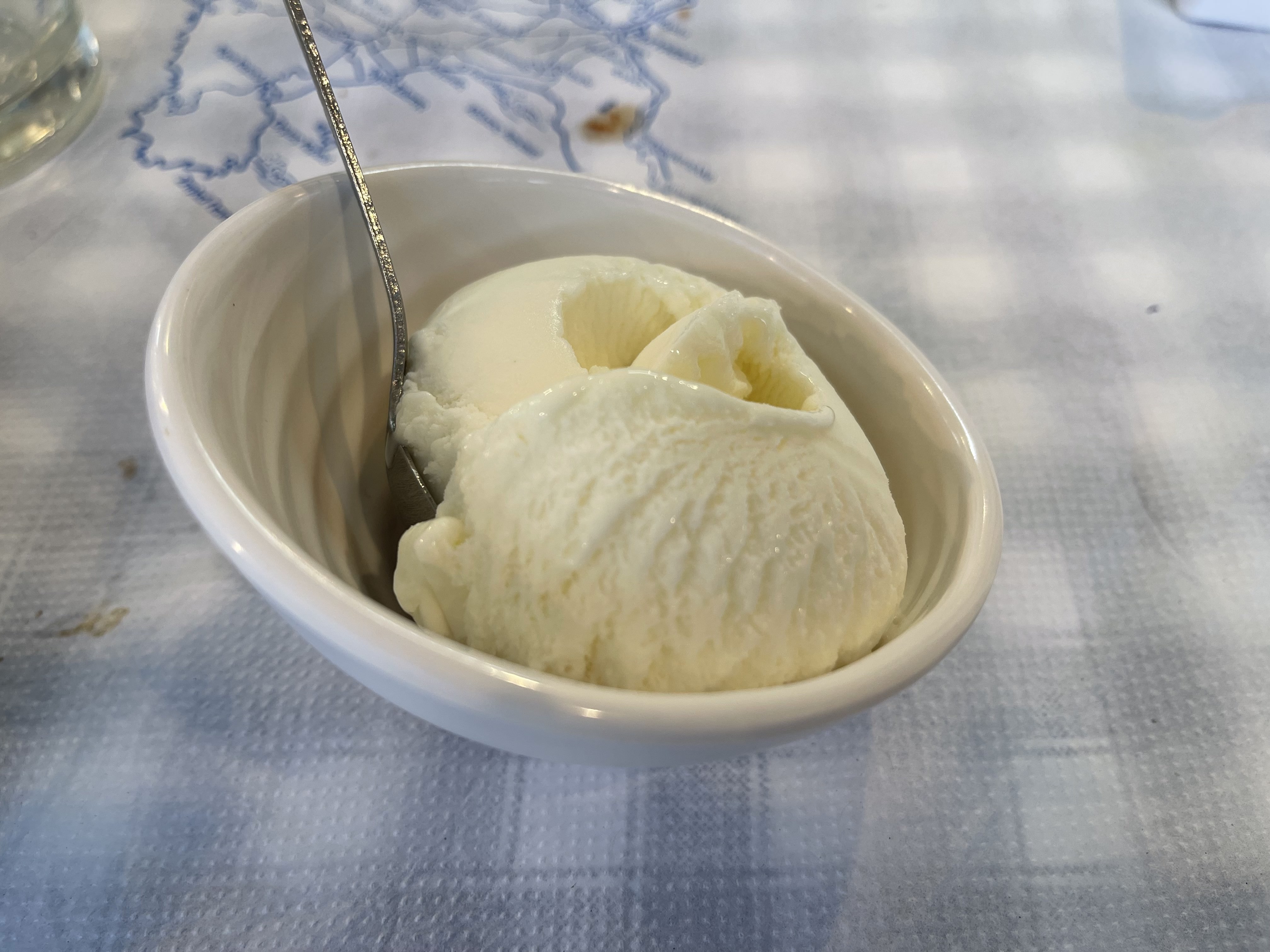 주요리도 얼핏 적어 보이지만 먹을 수록 양이 많다. 이렇게 먹고 나면 후식을 주문하지도 않았는데 후식 같은 것이 무료로 나온다. 아이스크림이나 수박 혹은 작은 케익이 나온다. 어느 한 식당은 소화시키는 데 도움이 된다면서 그리스 전통주(tendura)까지 덤으로 준다.