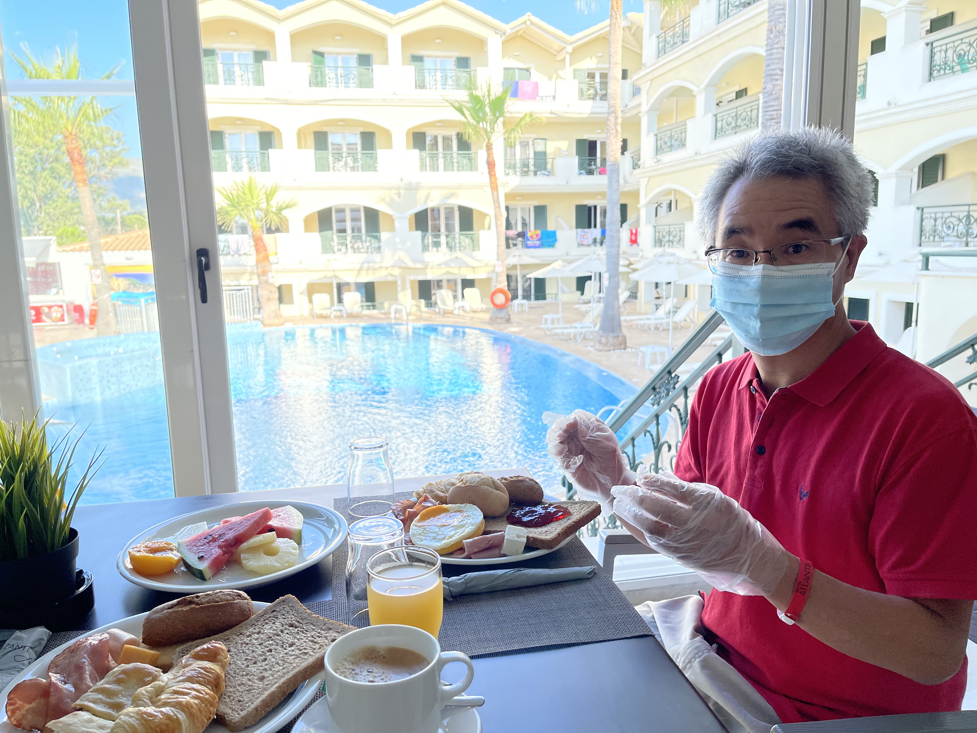 만족할 수준으로 나오는 호텔조식을 아침 9시경 든든하게 먹는다. 코로나바이러스로 인해 호텔 식당에는 1회용 비닐장갑이 마련되어 있고 식사하는 경우를 제외하고는 마스크를 착용한다.