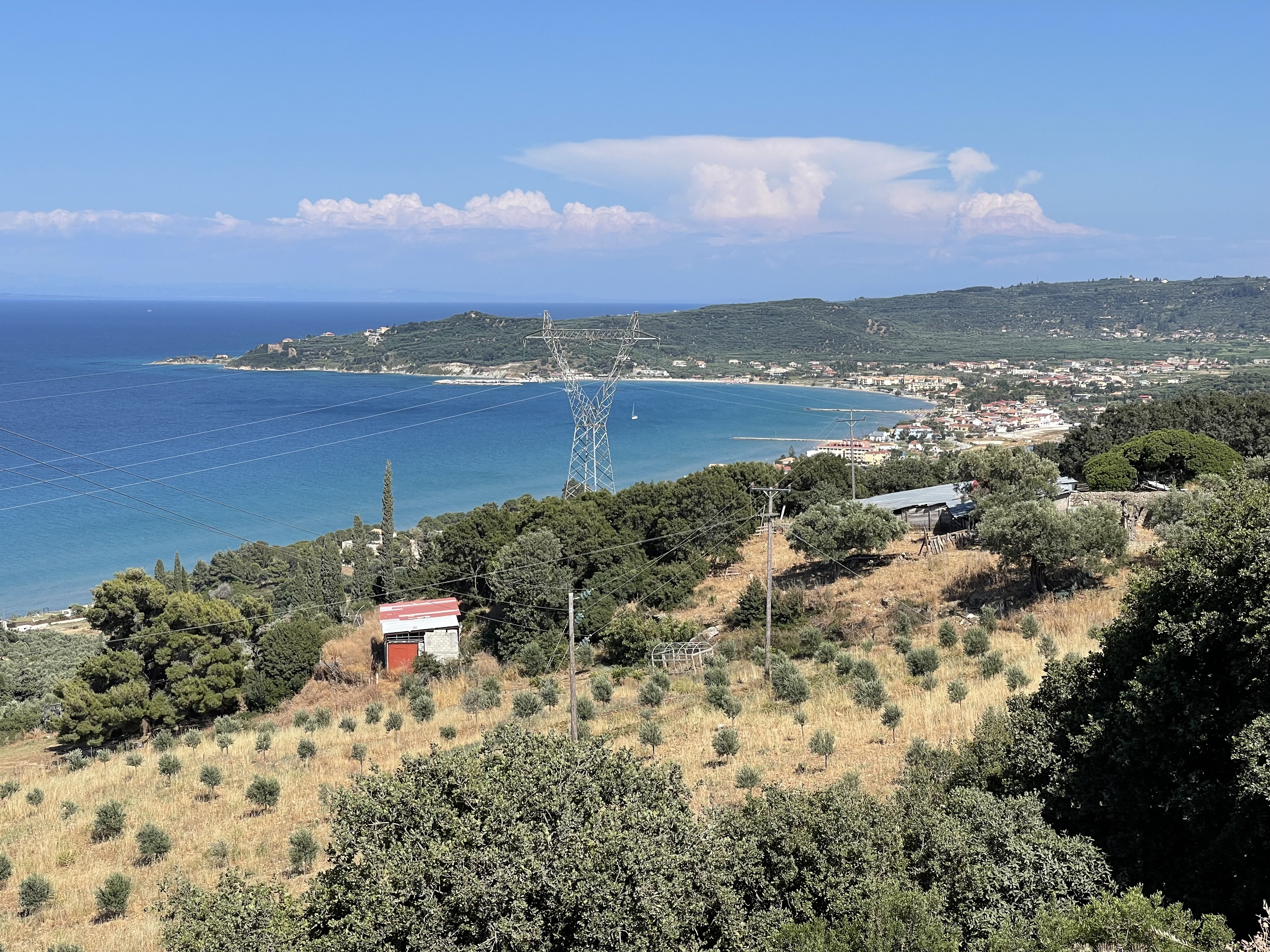 케팔로니아 섬과 나바지오 해수욕장으로 가는 항구가 있는 아기오스 니콜라오스(Agios Nikolaos) 향하는 도로 언덕에서 잠시 쉰다. 밑으로 내려다보면 말들이 한가로이 풀을 뜯고 있고 해변쪽 오래된 올리브나무와 언덕쪽 새로운 올리브나무들이 공존하고 있다. 원추형으로 우뚝 솟아있는 나무가 사이프러스(지중해 측백나무)다.