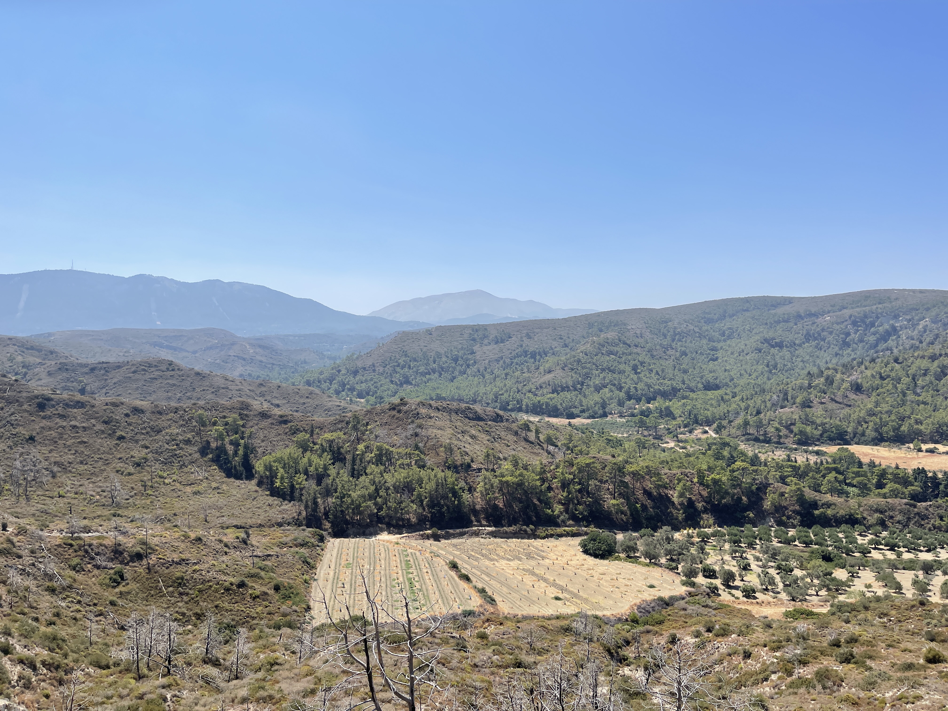 산정상에서 밑으로 내려다보면 주변에는 지금도 올리브와 무화과 나무 재배지를 흔히 볼 수 있다. 저 멀리 보이는 산이 로도스 섬에서 가장 높은 산 아타비로스(Attavyros 1215m)다.