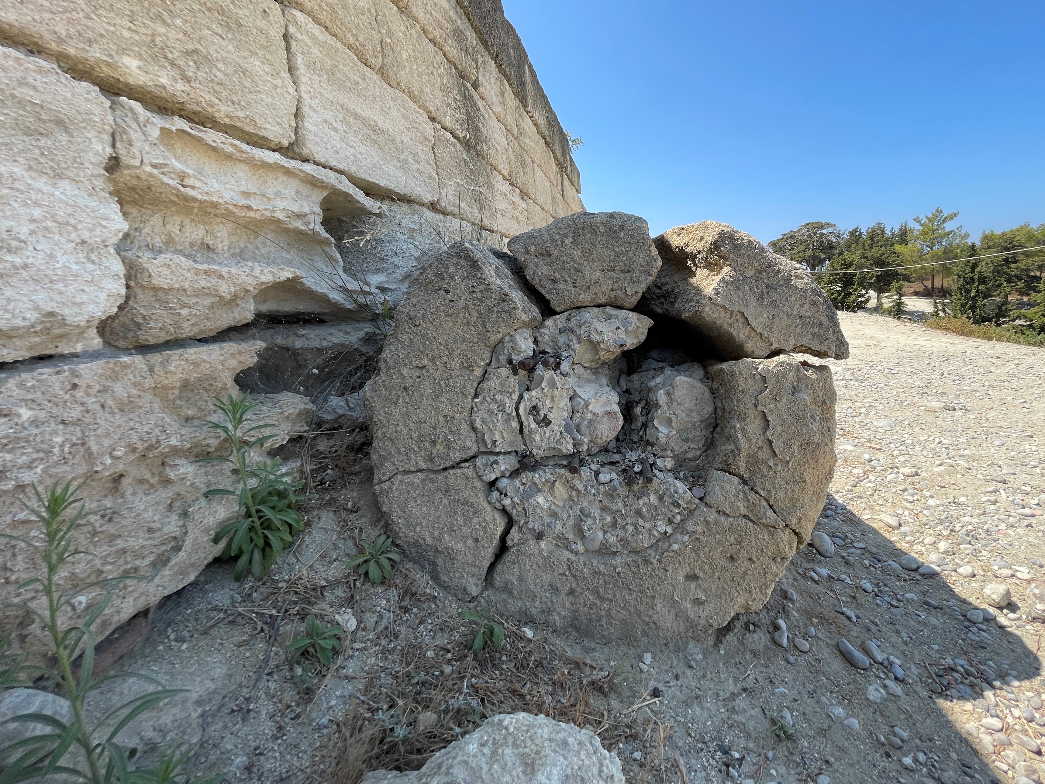 아크로폴리스에 있는 스토아(stoa - 지붕이 있는 통로) 건물의 쓰러져 있는 기둥이다. 기둥의 가운데를 뚫어서 돌 등을 섞은 골재를 넣어 기둥을 강화한 것으로 보인다.