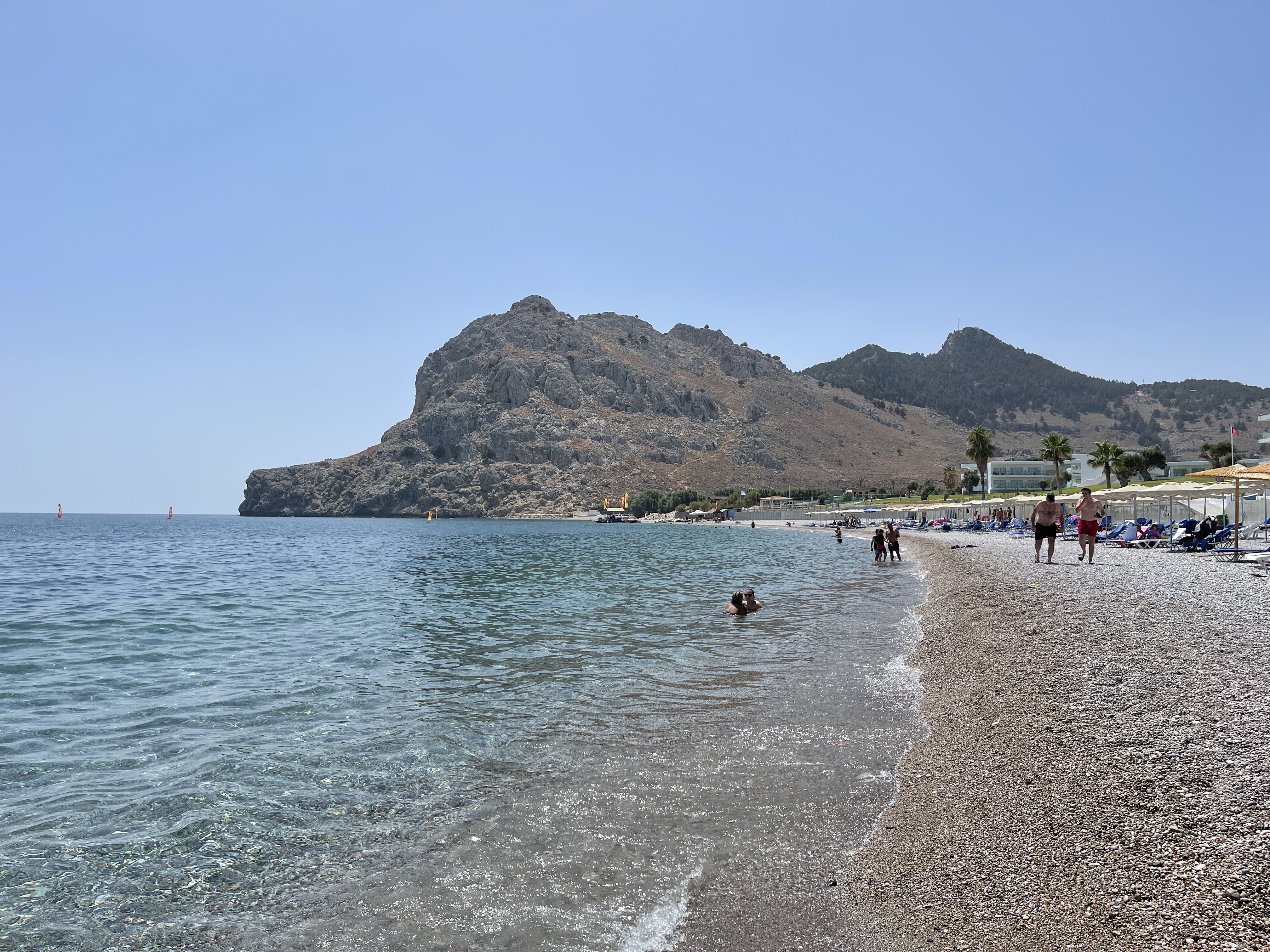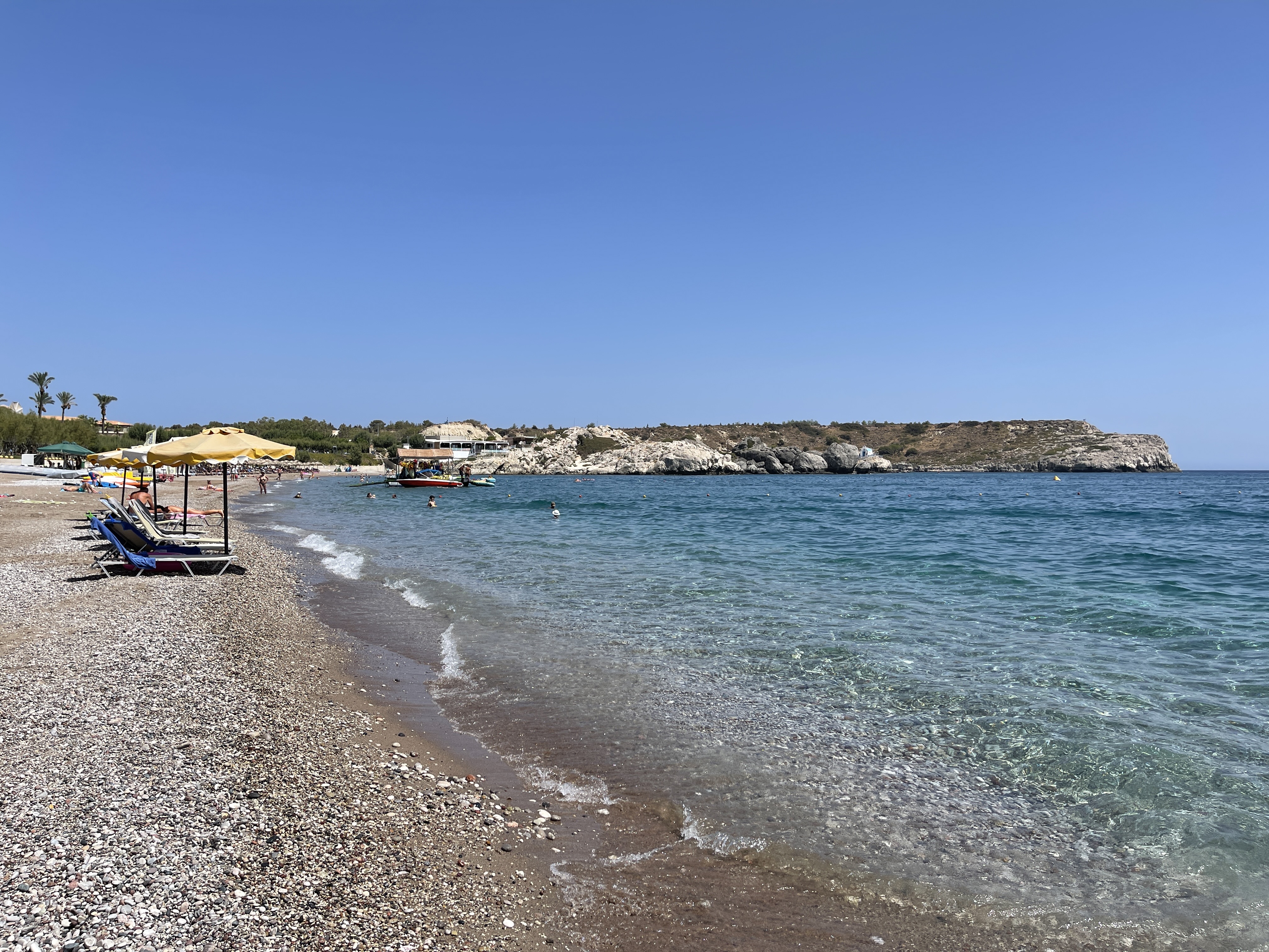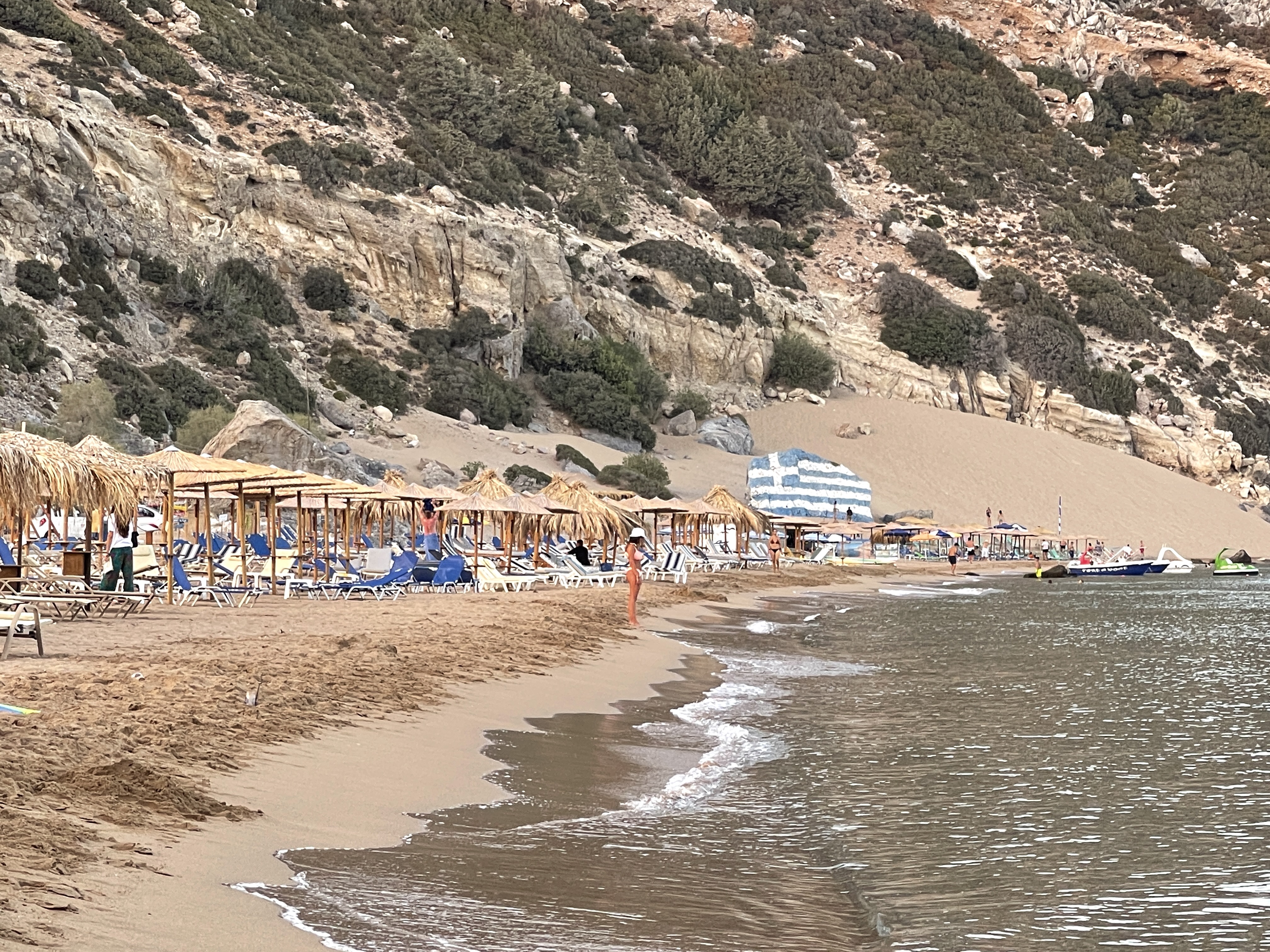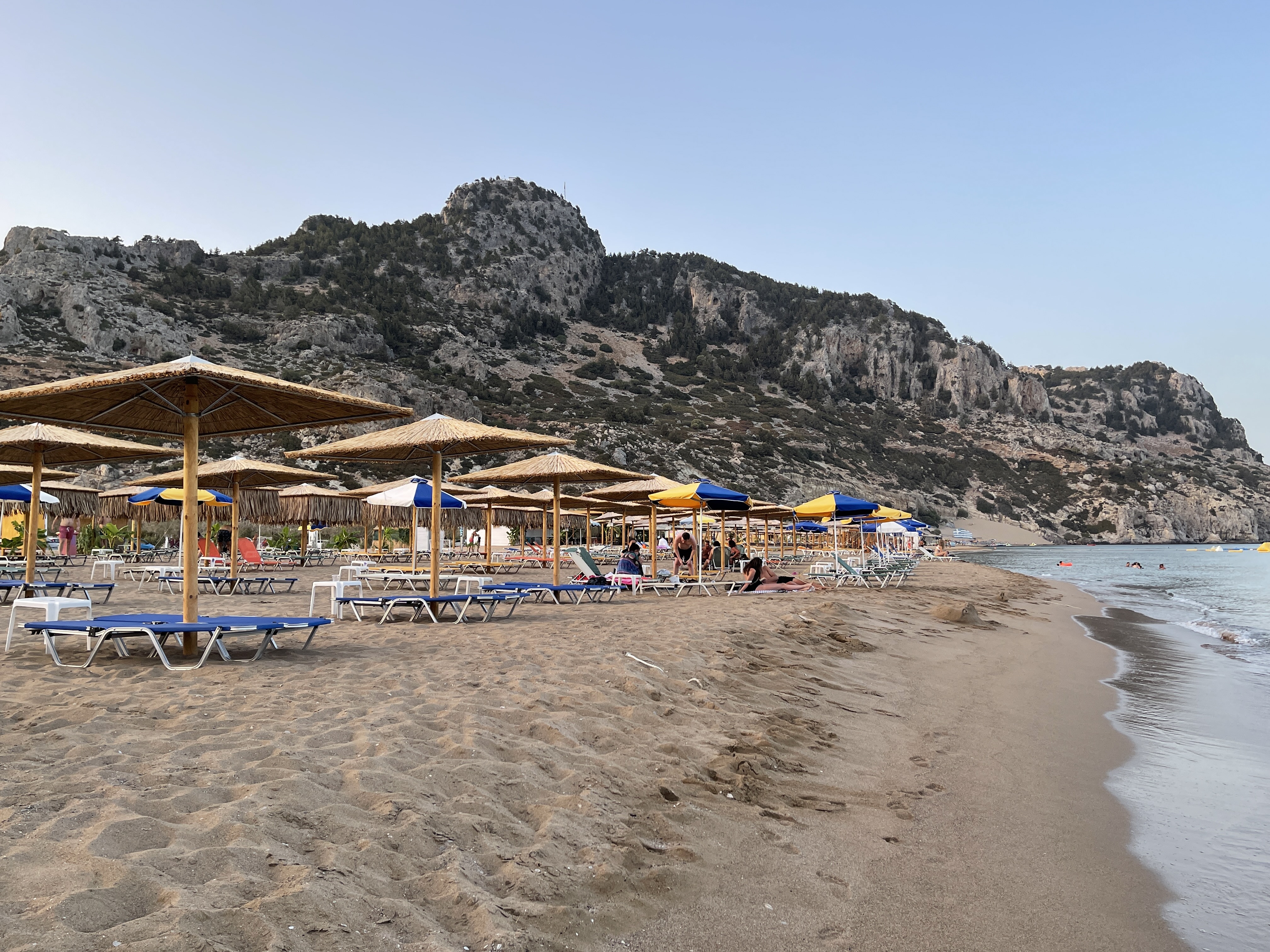 벌써 석양이 비치는 해수욕장이라 사람들은 거의 자리를 떠났다. 해변의자 두 개 사용료 10유로 안내판이 눈에 확 들어온다. 로도스 엘리 해수욕장은 3유로였고, 린도스 해수욕장은 무려 40유로였기 때문이다.