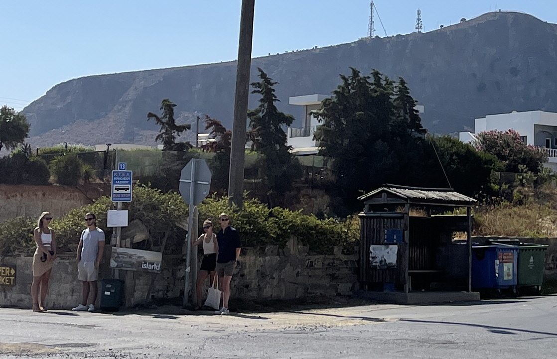 그리스 대중교통이 제대로 운영이 되고 있을까를 경험할 수 있는 좋은 기회다. 5분 후 안내판에 지정된 시간에 와야 할 버스가 오지를 않는다. 8월 하순 햇볕도 따갑다. 기다리는 사람들은 정류장 바로 옆에 있는 올리브나무밭 그늘에서 이를 피한다. 30분을 더 기다려서 다음 지정된 시간에 오는 버스를 탄다. 이 버스도 10분 늦어서 도착한다.