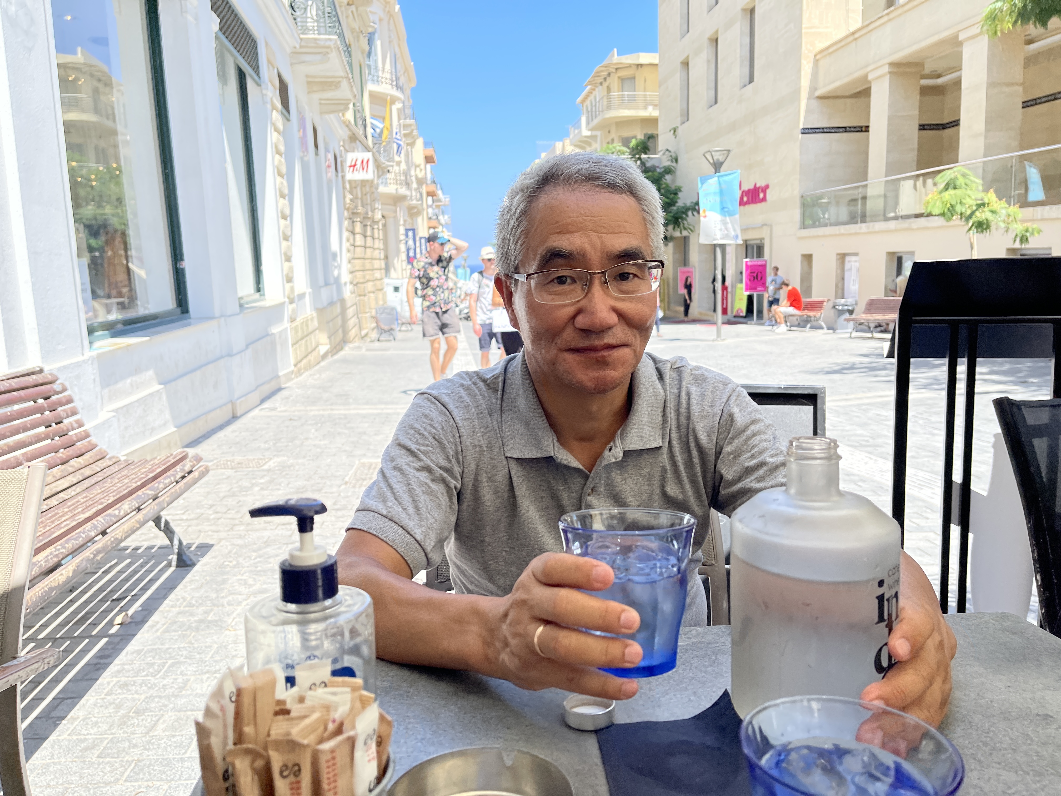 이제 8월 25일 거리 도보여행을 영상에 다 담았으니 잠시 쉴 때다. 커피 한 잔을 주문하자마자 종업원이 제일 먼저 얼음이 담긴 잔과 물이 가득 가득 찬 병을 가져 준다. 북유럽 나라들에서는 상상할 수 없는 무료 제공이다. 폭염과 갈증으로 지친 몸이 정말 고마워한다.
