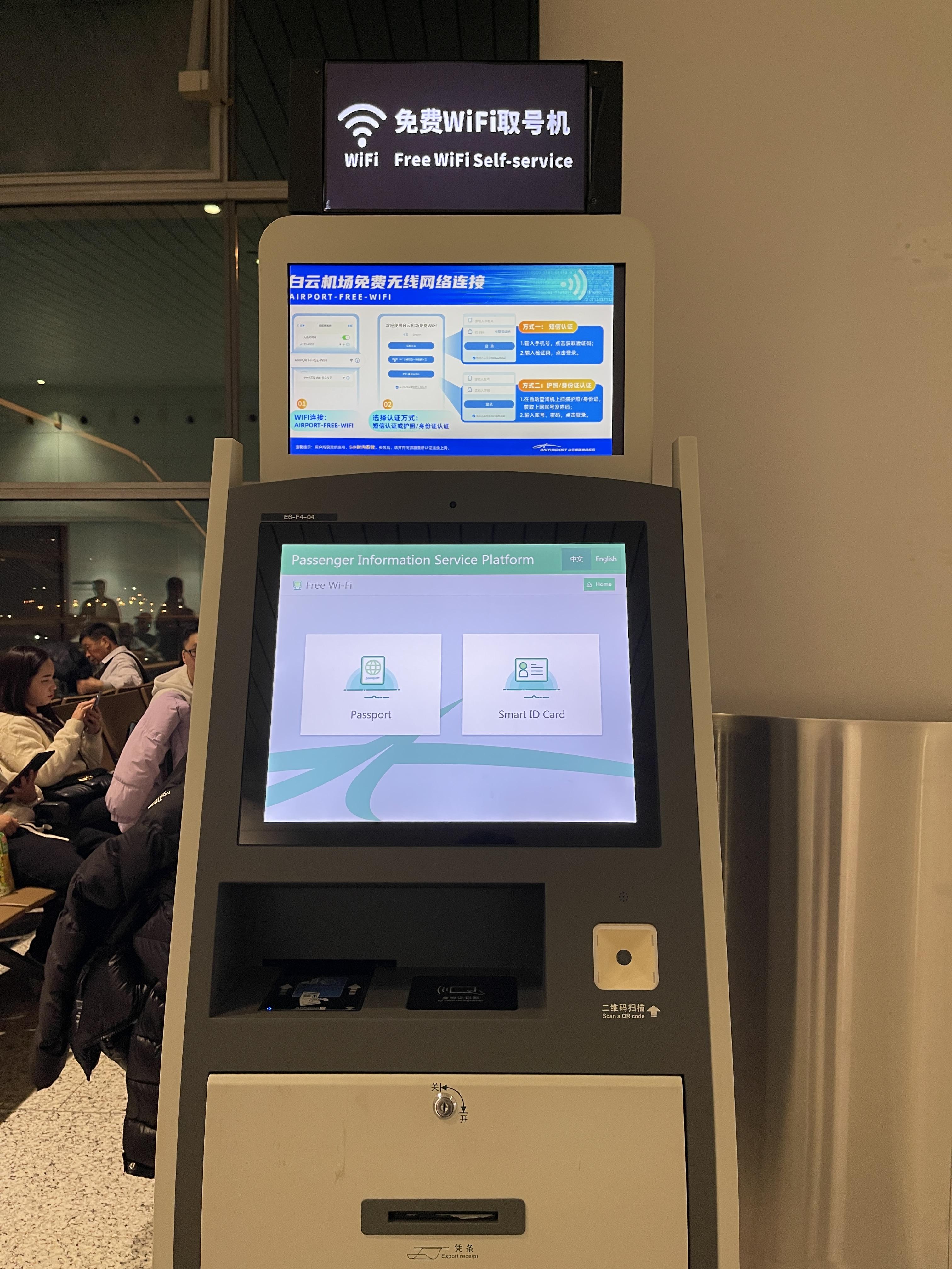 광저우 공항에는 아래 사진에서 보듯이 와이파이 비번을 받는 기계가 설치되어 있다. 절차에 따라 여권을 밀어 넣고 비번에 적힌 쪽지를 출력받으면 되다. 이렇게 여러 번 받아서 시도해도 접속이 원활하지가 않다. 주변 사람들도 인터넷이 제대로 되지 않는다고 한다.