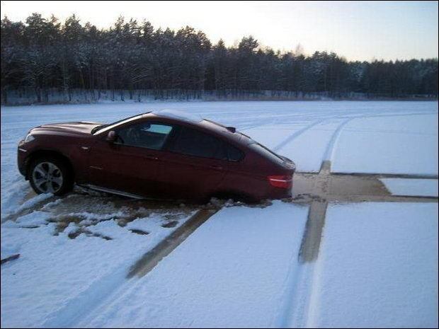 폴란드 조몬스터 사이트에 오늘 올라온 사진이다. 얼음에 뒷바퀴가 풍덩 빠져버린 고급차 BMW이다.