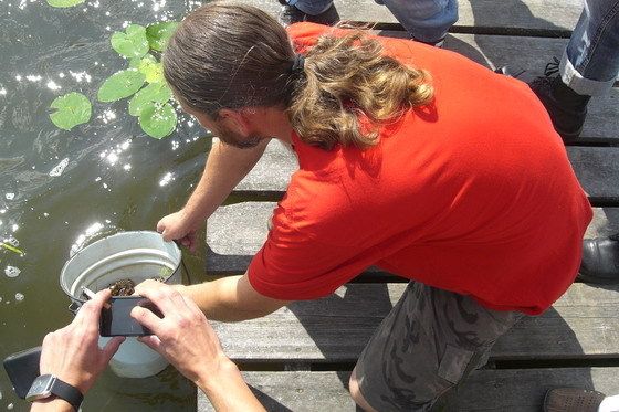 ▲ 먹기 시합 전에 가재를 호수에 방생하고 있다.