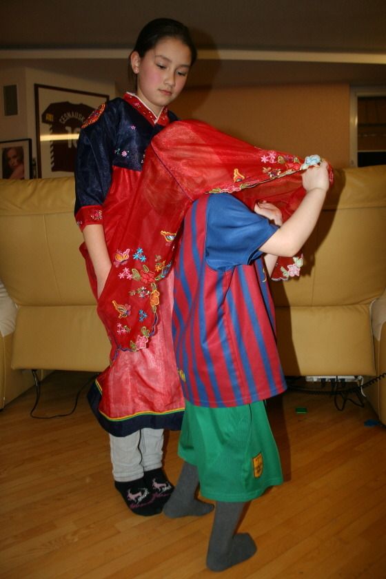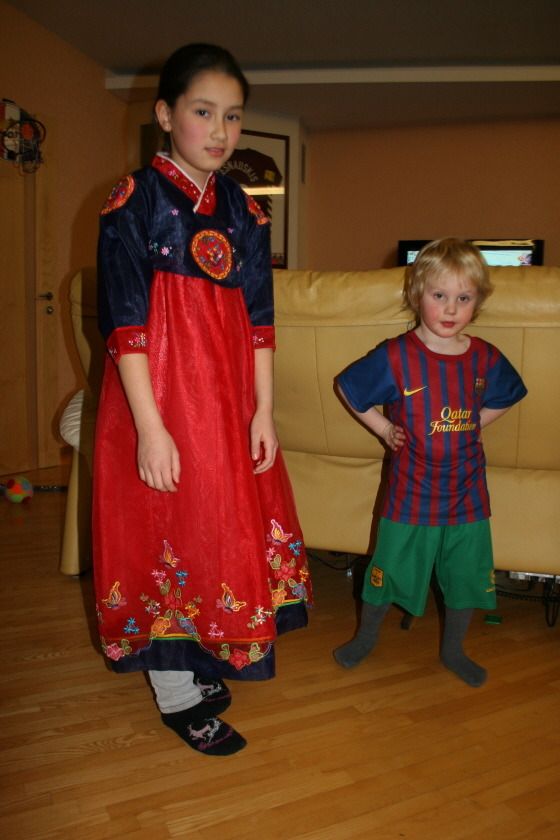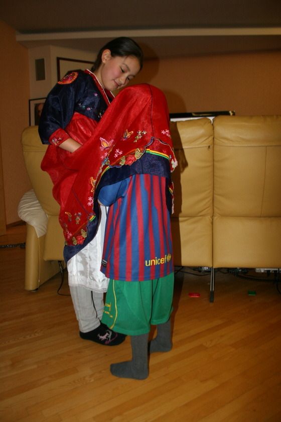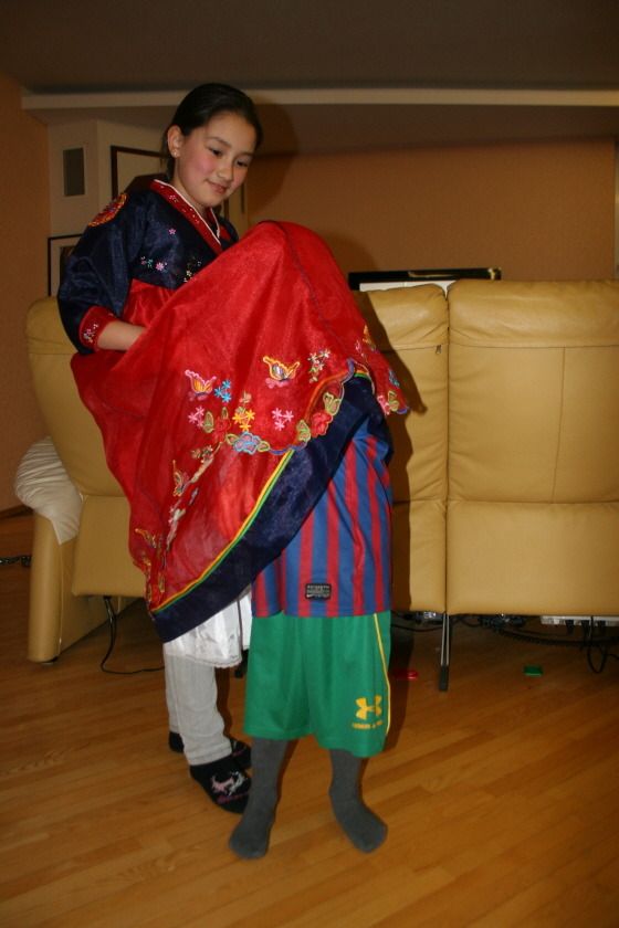 며칠 전 딸아이가 한복을 입고 가까운 친척들의 평가를 받은 적이 있었다. 과연 이 짧은 한복을 입고 노래 대회[관련글]에 나갈 것인지에 대한 의견을 구하는 자리였다. 이때 친척의 세살짜리 아들이 한복을 처음 보았다. 신기한 듯 기념 사진을 찍어달라고 자세까지 잡았다.
