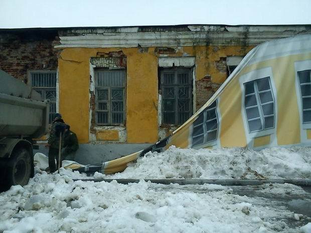 도시설립 1000주년을 맞아 도시 건물 재건축 작업을 했다. 그 중 하나가 이 도시에 위치한 군장교학교 건물도 포함되었다. 외관을 보면 손색 없이 재건축을 한 모습이다. 그런데 이 재건축의 진실이 밝혀지고야 말았다. 정확한 이유는 알 수 없지만 겨울철과 습기로 인해 눈가림을 한 천막이 버겨진 것 같다. [사진출처 | imgae source link]