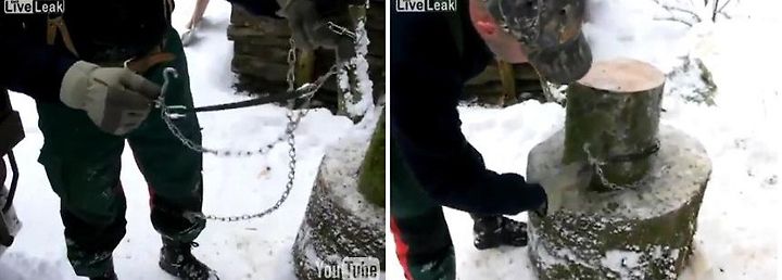 크기를 쉽게 조절할 수 있는 쇠사슬을 나무토막 밑에 묶는다. 도끼질을 쉬임없이 한다. 장작이 밖으로 튀겨나갈 염려가 없다. 또한 쪼갠 장작을 다시 쪼개려면 허리를 굽혀서 주워야 하는 데 이런 수고와 시간을 절약할 수 있다. 이렇게 간단하고 기발한 방법이 있는 줄이야...... 리투아니아 일가친척에게 권해야겠다.
