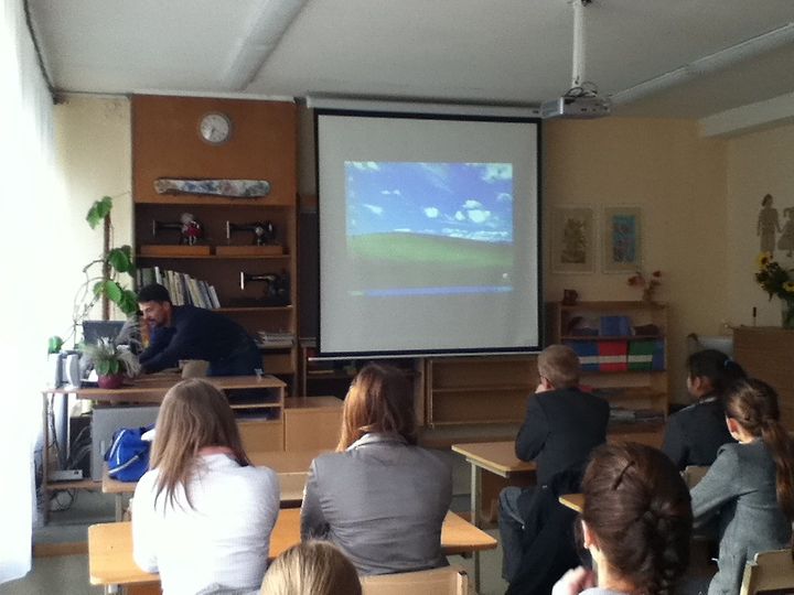 리투아니아 학교 교실은 어떤 모습일까? 궁금해 하는 사람들이 있을 것 같아 에스페란토를 소개하는 동안 교실 모습을 찍어보았다. 몇해 전에는 볼 수 없었던 빔프로젝트, 스크린, 컴퓨터 등이 잘 갖춰져 있었다.