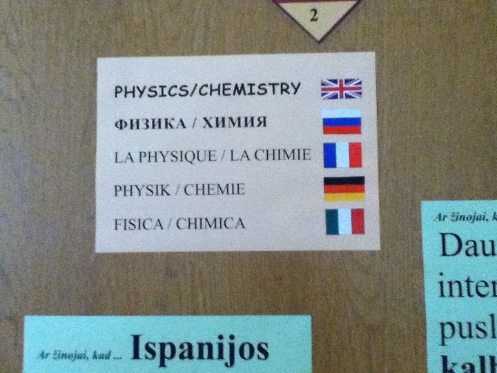 이 학교 교문을 열고 들어가니 눈에 띄는 것이 있었다. 교실문마다 종이가 붙여져 있었고, 이 종이에는 그 교실에서 이루어지는 과목이 다섯 개 언어로 써여져 있었다.
