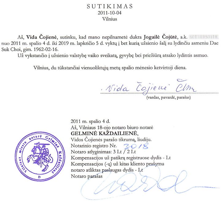 리투아니아 법에 따르면 부모 중 한 사람이 미성년자 자녀를 데리고 해외로 나가려면 부모 한 쪽의 동의서를 공증받아야 했다. 하지만 이제 이 사항이 폐지되어 동의서가 없어도 된다. 이제 얼마 후 딸아이와 둘이서만 한국에 간다. 아내의 동의서 없이도 리투아니아를 출국할 수가 있다. 하지만 불안요소는 있다.