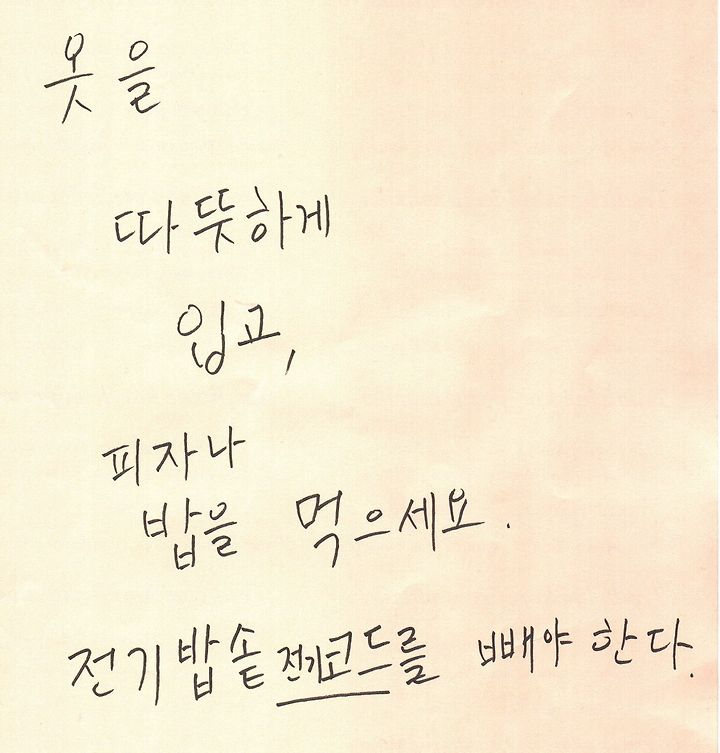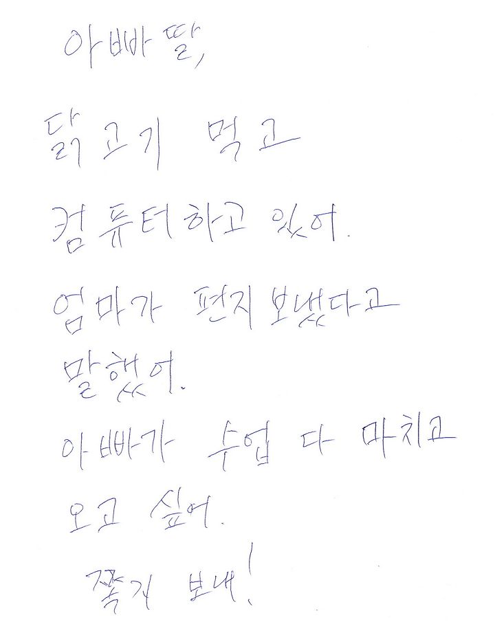또 다른 힘들은 아직 미성년인 만 10살 딸아이를 돌보는 일이다. 딸은 특히 어두워지는 저녁 시간에는 홀로 있기를 싫어한다. 그런데 어쩔 수 없는 일이 하나 있다. 월요일과 수요일 딸아이는 발레 수업을 듣고 저녁 6시경에 돌아오고, 나는 5시 30분경 수업을 듣기 위해 집을 나가야 한다. 아래는 바로 이때 딸에게 남긴 쪽지이다.