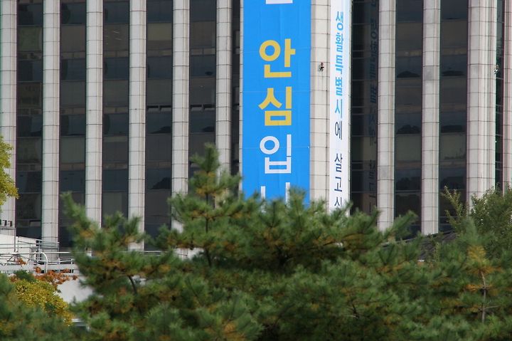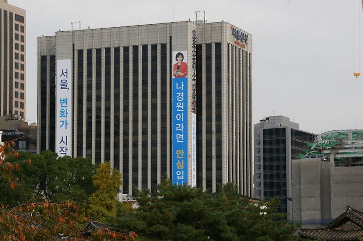 최대의 관심사였던 서울시장 선거가 끝났다. 결과는 박원순 야권 대표가 시장에 당선되었다. 10월 22일 수년만에 다시 덕수궁을 산책할 기회가 있었다. 덕수궁 안에서 한국프레스센터 건물쪽을 보자 나경원 후보의 현수막에 눈에 확 들어왔다.