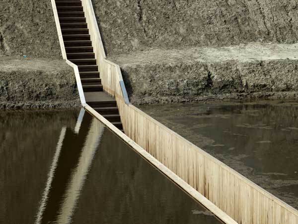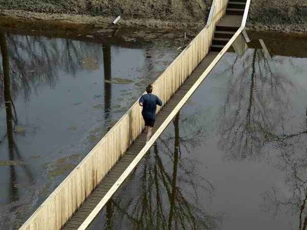 물 위에 건설된 다리가 아니라 물 가운데 건설된 아주 특이한 다리이다. 바다가 갈라지는 모세의 기적을 연상시키는 다리이다. 참호처럼 생긴 이 다리는 보행자를 위한 다리이다. 17세기 네덜란드 Roovere 요새를 둘러싸고 있는 해자(垓字)에 놓여있다. [사진출처 image source link | freshome.com]