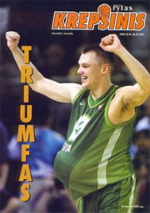 사진설명: 리투아니아 농구 잡지 '크렙쉬니스' 표지사진; 동메달을 획득한 후 농구공으로 임신한 채 기뻐하는 쌰루나스 야시케비츄스