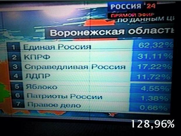 한편 유럽 누리꾼들 사이에는 러시아 선거방송 캡쳐화면이 화제를 끌고 있다. 한 선거구의 득표율 합계가 115.35%, 128.96%, 146.47%로 나왔다. 득표율 합계는 아무리 높아도 100%인데 이것을 넘어서버렸다.