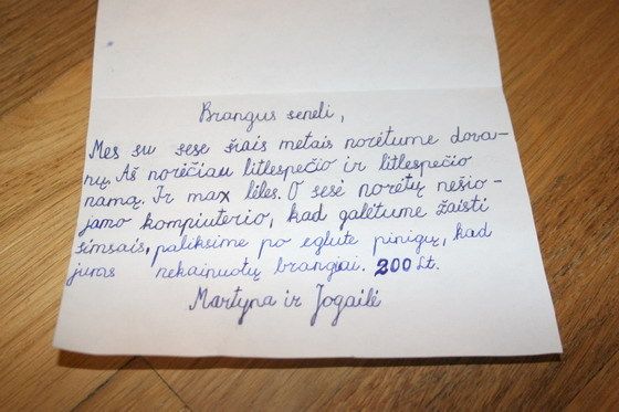 언니와 함께 올해도 선물을 받고 싶어요. 저는 리틀펫(little pet)과 리틀펫 집을 원해요. 그리고 아주 큰 인형도 원해요. 언니는 우리가 심스(Sims game)를 놀 수 있도록 노트북을 원해요. 할아버지에게 너무 비싸지 않도록 전나무 밑에 돈(200리타스, 약 10만원)을 놓겠어요."