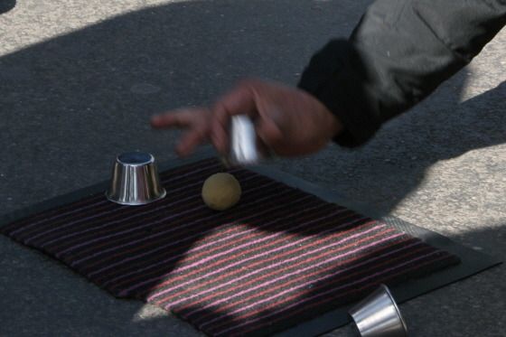 공이 어느 컵에 숨었을까를 추측하는 것보다도 사람들이 어떻게 행동하고 있나를 관찰하는 것이 더 재미었다. 살펴보니 돈을 잃는 사람이 없었다. 잃었던 사람도 나중에 더 많은 돈을 따는 것이었다. 그리고 구경꾼들이 없을 때 이 딴 사람이 속임꾼에게 돈을 주는 모습을 목격했다.