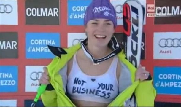주인공은 슬로베니아 선수 티나 마제(Tina Maze)이다. 일요일(10일) 자신의 경기가 끝난 후 잠시 기다리는 동안 그녀는 TV 카메라를 향해 스키복을 벗고 자신의 스포츠 브라(브래지어)를 노출시켰다. 이 브라에는 검은색으로 "NOT YOUR BUSINESS"(네 일이 아니야 혹은 너나 잘 해라는 뜻) 문구가 써여져 있었다.