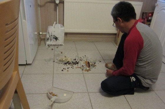 아내가 가장 아끼던 유리그릇이 그만 깨져버렸다. 그렇다고 아내가 올 때까지 방치할 수는 없었다. 그래서 비로 쓸어담으려고 했다.