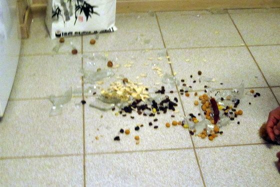 유리그릇이 냉장고가 있는 창틀 철상자 위에 놓여져있었다. 처음엔 안전하게 놓여져있는 것처럼 보였지만, 냉장고 문을 열 때마다 살짝 닿아서 조금씩 밀려날 수 있었겠다. 현관문 닫는 파장 영향으로 불균형하게 놓여있던 유리그릇이 바닥으로 떨어져 산산조각이 났던 것이 아닐까......