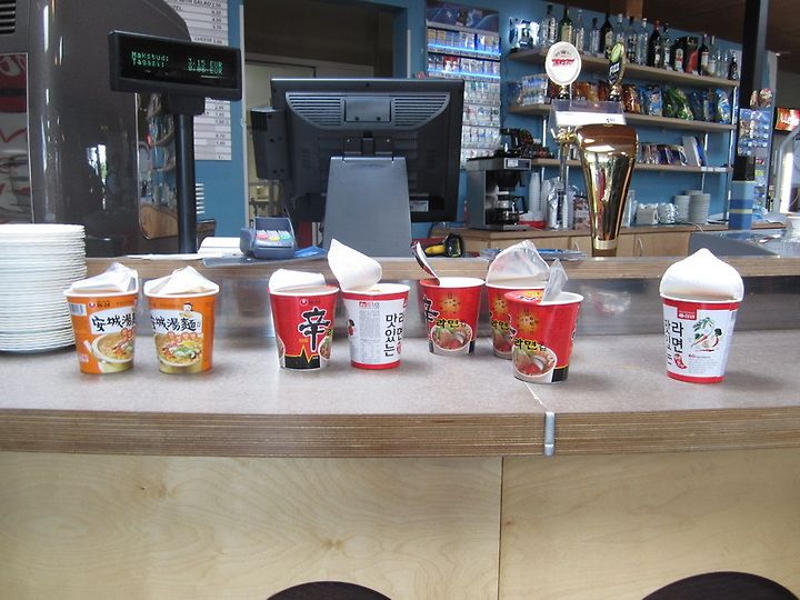 일행은 휴게소에 들어오더니 "뜨거운 물"을 사겠다고 했다. 이유는 간단했다. 대부분 컵라면을 꺼냈다. 컵라면이 휴게실 음식 판매대에 즐비했다. 마치 한국의 어느 편의점에 와있는 기분이 들었다. 이곳은 라트비아와 에스토니아 국경에 있는 에스토니아 휴게소이다.