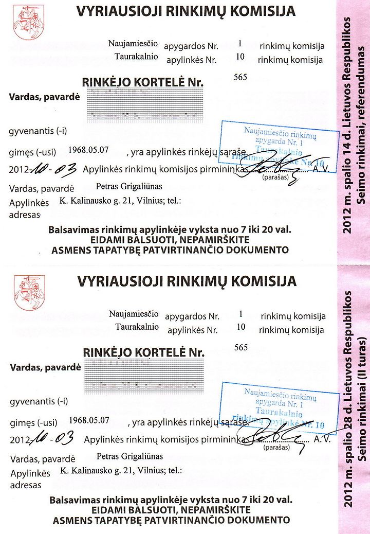 그런데 투표통지서가 1장이 아니라 2장이다. 이유는 이렇다. 한국은 1번 투표로 가장 득표를 많이 한 사람이 당선된다. 2012년 4월 한국 총선에서 무소속 박주선 후보가 31.55%으로 당선되었다. 리투아니아는 1차 투표에서 과반수를 얻은 후보자가 없으면 많이 득표한 1위와 2위가 결선투표에 올라간다. 그래서 통지서가 2장이다.