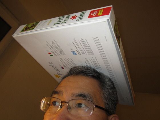 딸아이가 머리에 얹어놓은 퍼즐 상자에서