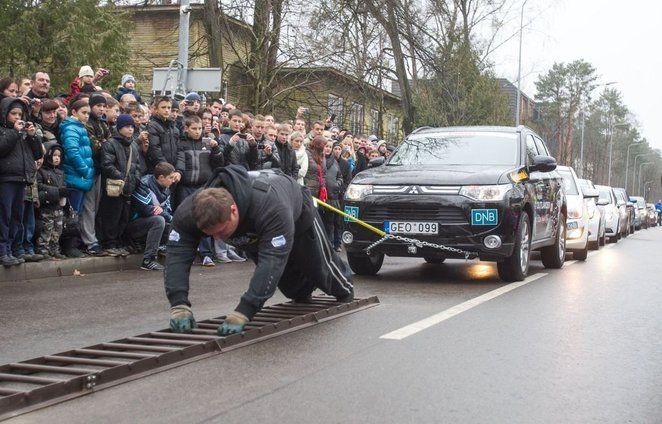 이날 38대 모두가 출동했다. 6차례 세계 챔피언을 한 사비쯔카스(37세)가 도전에 나섰다. 그는 철사다리를 땋에 눕혀 자동차를 끌어당겼다. 먼저 12대, 이어서 16대, 최종적으로 20대를 끌어당겼다. 20대 자동차의 총 무게가 2만7천5백13킬로그램이었다. 이번 성공으로 새로운 세계 기네스 기록을 세운 셈이다.
