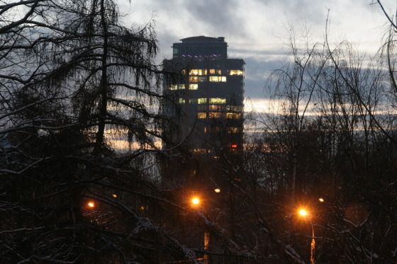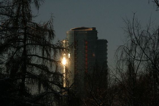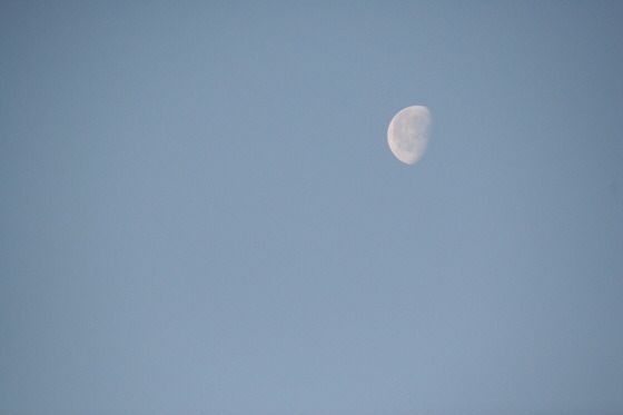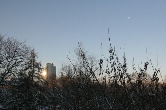 그리고 12월 4일 아침에 일어나 서쪽 하늘을 보니 파란 하늘에 하얀 반달이 떠있었다. 그리고 유리건물에 눈이 부실 정도로 비치는 햇살이 눈에 들어왔다. 반가운 해로구나!!!