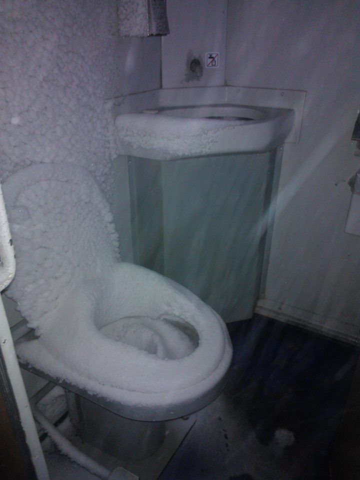 폴란드 북서지방 도시 쉬체친(Szczecin)에서 폴란드 수도 바르샤바까지 운행되는 기차에 있는 한 화장실이다. 12월 9일 폴란드인 아르투르 카민스키(Artur Kaminski, 68세)가 화장실을 이용하기 위해 들어가자 좌변기가 꽁꽁 얼어있었다. 당시 영하 3도였지만, 좌변기는 약 10cm 가령의 눈과 얼음으로 뒤덮여있었다.