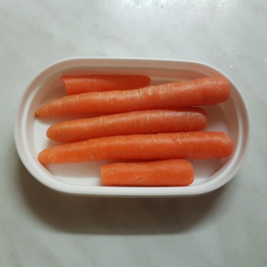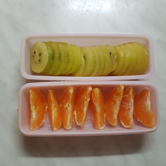 야채, 당근, 키위, 귤로 도시락을 쌌다.