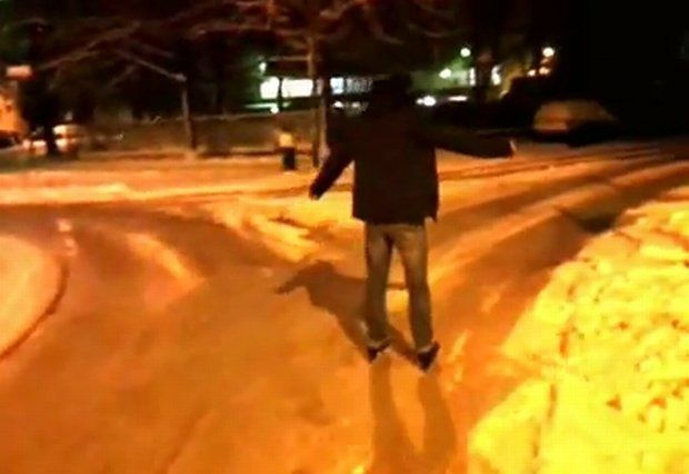 도심 빙판 도로에서 스케이트를 타다니