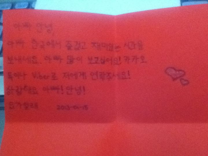도대체 무슨 내용이기에 딸아이가 이토록 '한국에서 읽으라'고 강요하듯이 할까 궁금했지만 부탁대로 해야 했다. 한국에 도착해 편지를 뜯어보니 딸아이의 부탁을 쉽게 해야 하게 되었다. 이유는 바로 편지를 '한국어'로 썼기 때문이다.