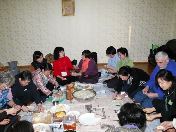 ▲ Ĉiuj preparas pastbuletojn por la korea manĝaĵo 'tokmanduguk'.