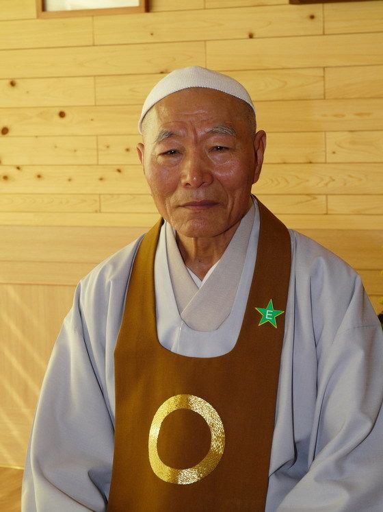 ▲ Esperantistoj vizitis la ĉefmajstron Gjongsan, la ekleziestron de ŭonbulismo.