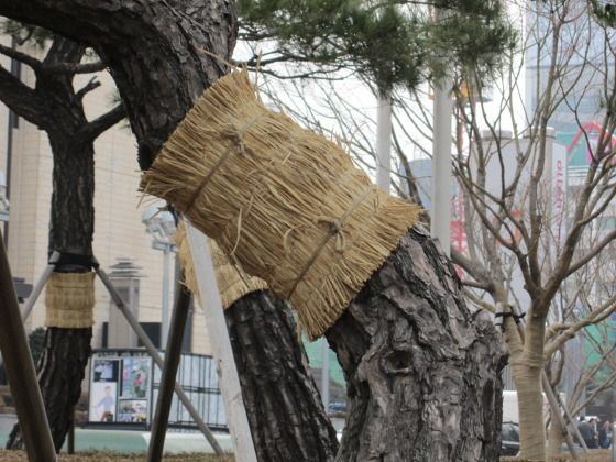 그런데 교보문고 건물 앞에 있는 나무들은 완전히 짚으로 둘러져 있었다. 이는 벌레보다는 혹한에 나무를 보호하자는 보온이 주된 목적으로 보인다.