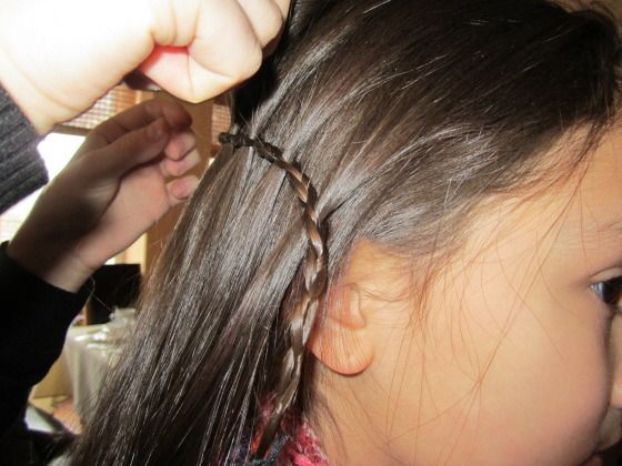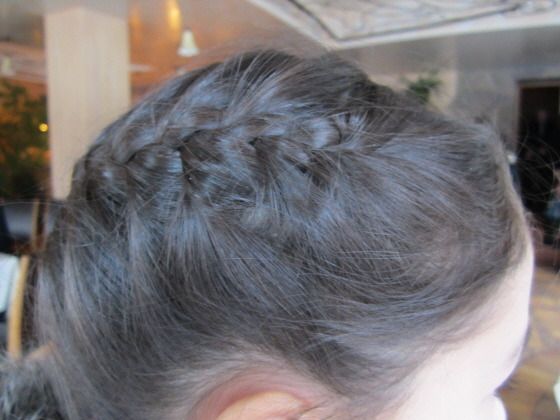 다음은 이마 바로 위에서부터 조금씩 시작해서 나사처럼 돌면서 머리를 땋았다. 끝부분은 일명 지네머리 모양을 하고 있다.