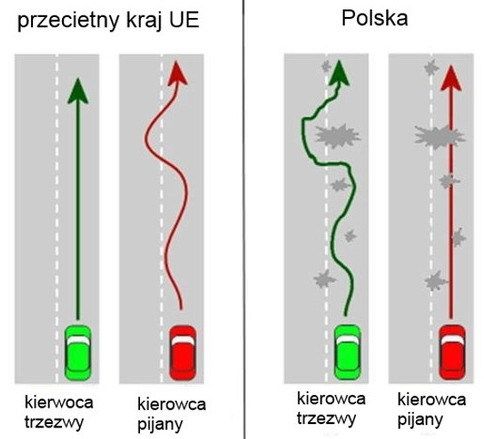우선 폴란드 사람들 사이에 인기 끈 그림을 소개한다. 왼쪽은 유럽 연합 평균 국가로 정상적인 운전자는 직선으로 달리고, 술취한 운전자는 이리저리 달린다. 오른쪽 그림은 폴란드로 정상적인 운전사는 이리저리 달리고, 술취한 운전자는 직선으로 달린다. 왜냐하면 노면구명을 피해 달리다보니 이리저리이고, 술취한 운전자는 차가 구멍에 망가져도 별다른 관심이 없기 때문에 직선으로 달린다.