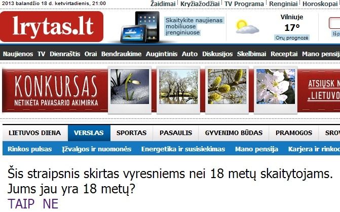 특히 리투아니아 최대 일간지 <례투보스 리타스>는 인터넷 기사를 읽으려고 들어가자 질문사항이 나왔다. "이 기사는 만 18살 이상에만 해당된다. 당신은 18살인가? 아니요 네" [아래 캡쳐 화면]