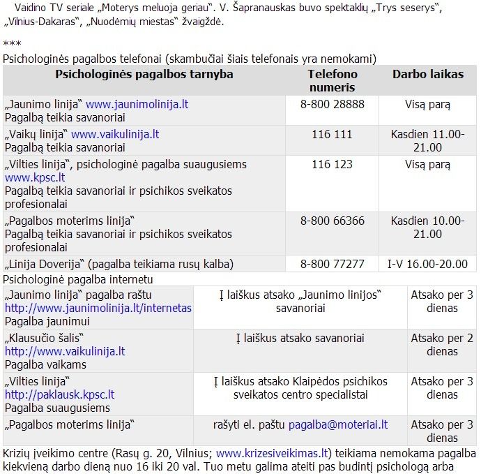 이 기사 밑에도 전화 심리상담 안내가 있었다. 10만명당 스스로 생을 마감하는 사람의 비율은 한국이 31.7명이고, 리투아니아가 31.6명이다. 이는 리투아니아 사회가 직면한 가장 큰 문제 중 하나이다.