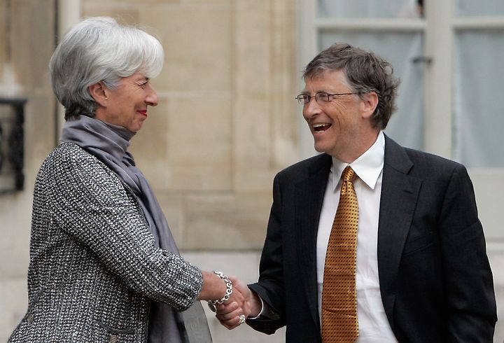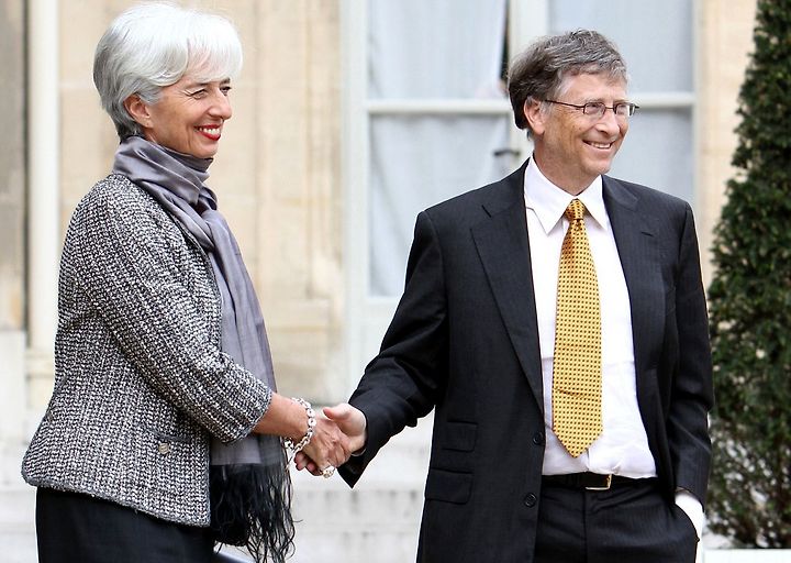 아래는 2011년 4월 4일 프랑스 엘리제궁에서 프랑스 크리스틴 라가르드 재무장관과 악수하는 빌 게이츠의 모습이다.