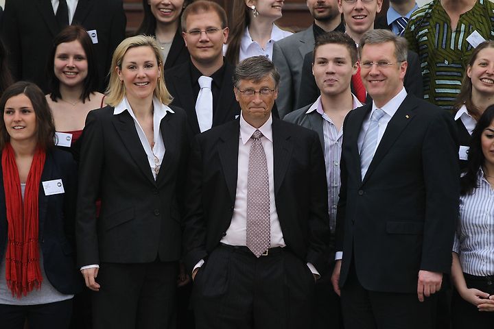 아래는 2011년 4월 6일 베를린에서 크리스티안 울프 대통령 내외 사이에 있는 빌 게이츠의 모습이다.