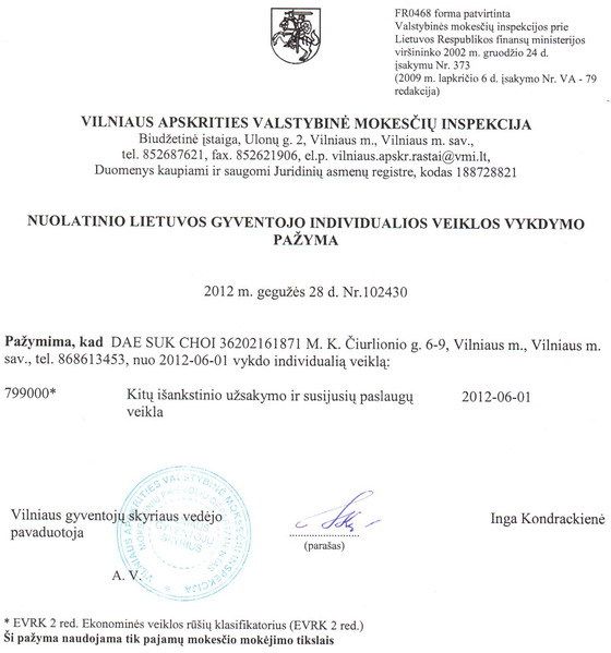 어떻게 종합 소득을 신고해야 할 지 정확한 정보가 없어 차일피일 미루다가다 4월말에야 리투아니아인 아내가 인터넷으로 하게 되었다. 어느 나라나 마찬가지이겠지만 세금 관련 일은 해결하기가 그렇게 쉽지 않다. 아내는 여기저기에서 유익한 정보를 얻었고, 의문 되는 것은 인터넷 검색을 통해 지식을 습득했다. 어느 정도 준비가 된 후에 인터넷 온라인을 통해 내 종합 소득을 신고하는 데 성공했다.